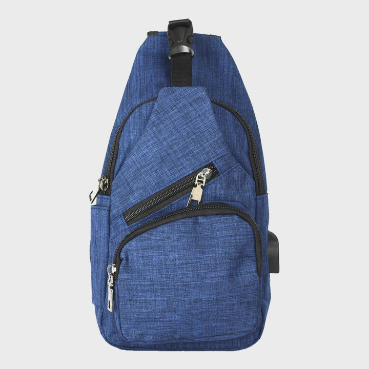 The zipper on the main compartment can be clipped closed, preventing someone from easily unzipping your bag and stealing your things. There's a USB port outside of the pack so you can charge your phone while using it. Place a portable power bank (not included) inside of the pack and connect it to the cable in the bag. Now you can plug your phone to the external port and charge without opening your bag.