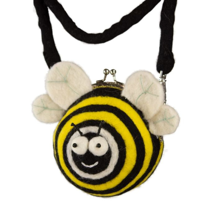 This adorable critter purse has lots of personality! Can also be used as a piggy bank, tooth fairy house, or just a totally charming tabletop friend. The 48" lobster claw strap is detachable from the metal snap closure. The interior is a single unlined compartment. Hand felted with 100% natural wool using non-toxic dyes. Exceptional felting and stitching workmanship from Nepal.