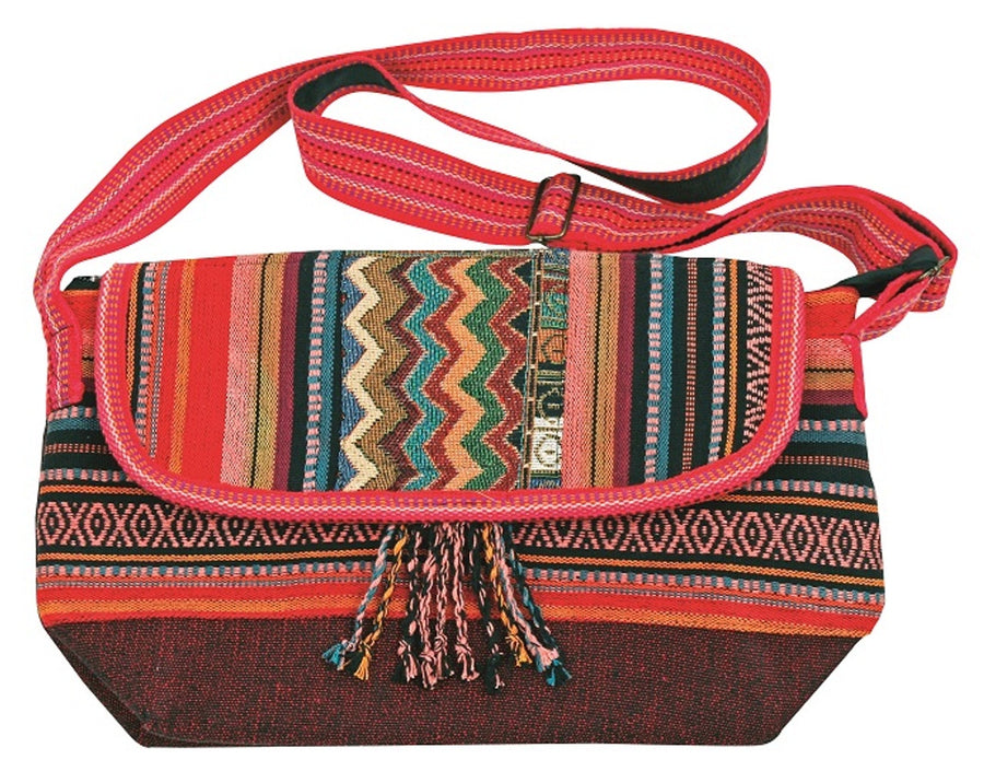 Cool purse with hand loomed material in patch work design. Small flap zipper close Adjustable Strap