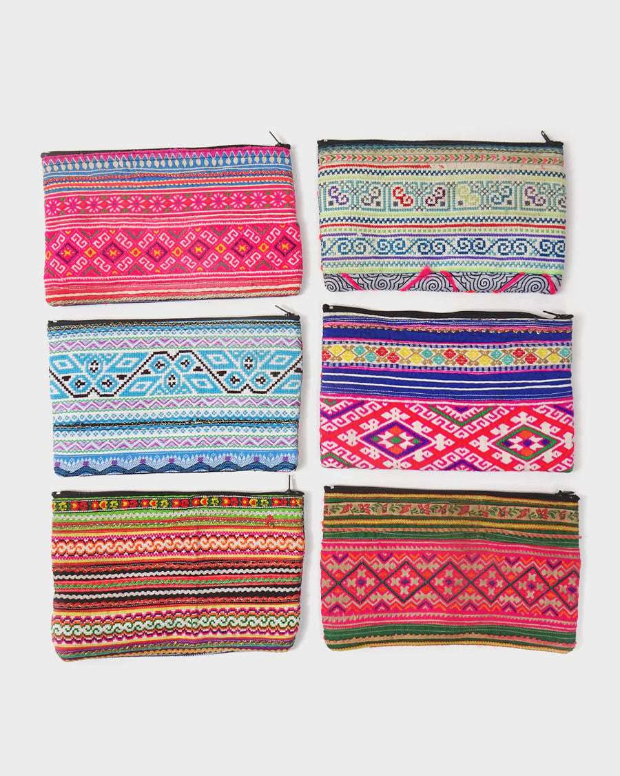 This large pouch features authentic vintage Hmong embroidery on the front with a zipper closure. The back has batik detailing with brightly colored threads and is slightly padded for extra protection carrying electronics, etc.