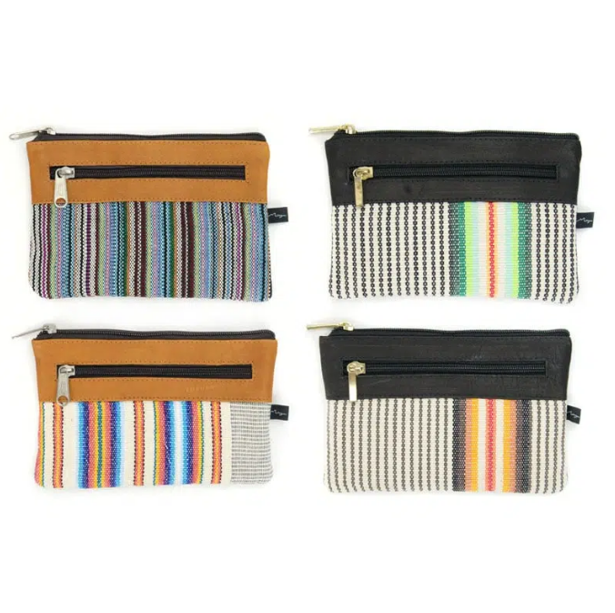 A sensible and durable pouch made with leather and acrylic fabrics. Comes in a variety of different colors and patterns. Perfect for storing money, receipts, accessories, phones, and cosmetics.