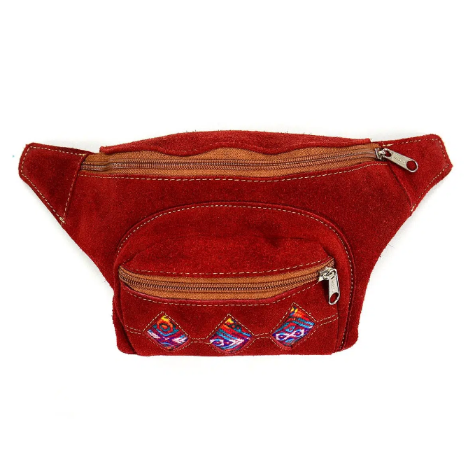 Quality suede leather fanny pack with three zippered compartments and windowed chumbi textile.