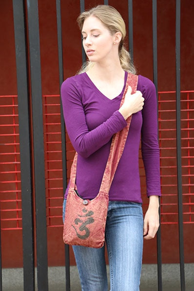 Small stonewashed cotton crossbodypassport sling with screen print design.Black cotton lining with button closure.