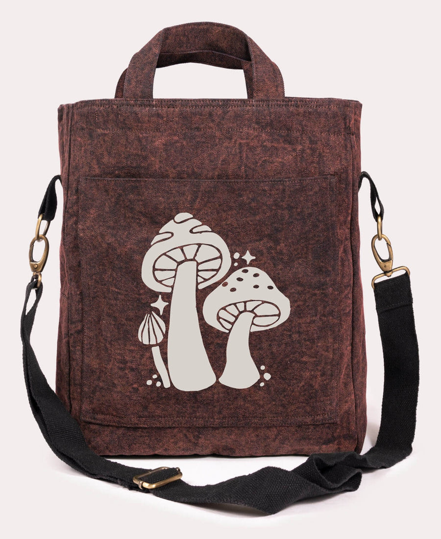 Let this Three Little Mushrooms Forager Bag inspire magic and help you gather all the best finds. Perfect for foraging mushrooms in the forest or at the farmer's market. Features our three little mushrooms design on a large, open outside pocket, a zipper closure, and an inside zipper pocket. Wear this versatile bag as a crossbody or remove its clasps to use it as a handbag. Completes with a zipper closure and black lining. 12 x 14 x 5 inches with a 30-60 inch removable and adjustable strap. Acorn Brown.
