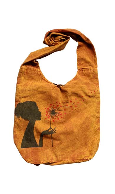 Discover our versatile stonewashed cotton shoulder bag with a unique dandelion girl print. Adjust the bow tie closure for a perfect fit, convert it into a backpack, and enjoy its soft, durable fabric. A stylish, spacious companion for all your essentials.