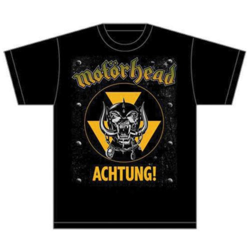 An official licensed Motorhead Unisex Tee featuring the 'Achtung!' design motif. This high quality t-shirt design is available in the black colourway.