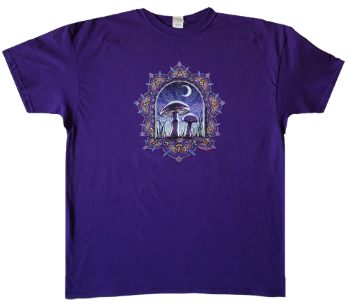 Mushroom Mandala On a purple T-shirt. Silk screened on a 100% cotton heavyweight T.