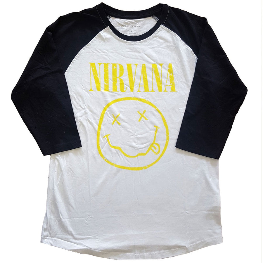 An official licensed Nirvana Unisex Raglan T-Shirt featuring the 'Yellow Happy Face' design motif. This high quality Raglan T-Shirt is available in a black & white colourway.