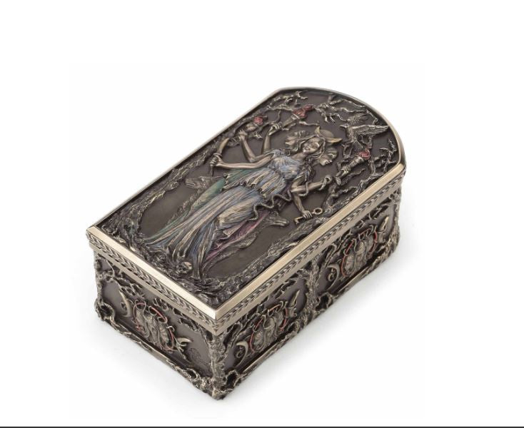 Hecate is a goddess of Greek mythology who was capable of the duality of both good and evil. She was associated with witchcraft, magic, necromancy, the moon and creatures of the night such as hell hounds and spirits. She is often depicted as a goddess with three faces, representing her role of the guardian of the crossroads and her association with the lunar cycle. Hecate was one of the main deities worshiped in Athenian homes as a protective goddess, shrines of Hecate were placed at doorways with the belief that she will protect people from the dead and evil spirits.