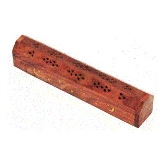 12" wood coffin box style incense burner. This coffin incense burner features a carved wood top that lifts open. It has a storage compartment that opens from the side. It has brass inlay moons and stars on the side.