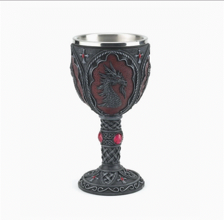 This Dragon Goblet shows a dragon with a blood red background with matching red rhinestones around the Chalice. There is Celtic knotwork all around the goblet. It is 7 inches tall and comes with a removable Stainless Steel cup insert for easy cleaning.