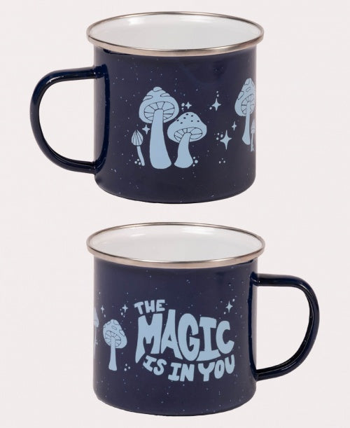 This Magic Mushrooms Enamel Camping Cup will bring enchanting vibes with you as you warm by the campfire. Feel all the magic vibes with its wrapped mushrooms print and the message: the magic is in you. Pour in your favorite hot or cold drink as you lounge amongst the trees or lie under the starry sky. Designed to clean easily with its speckled, enamel coating and c-shape handle. Navy with speckles.