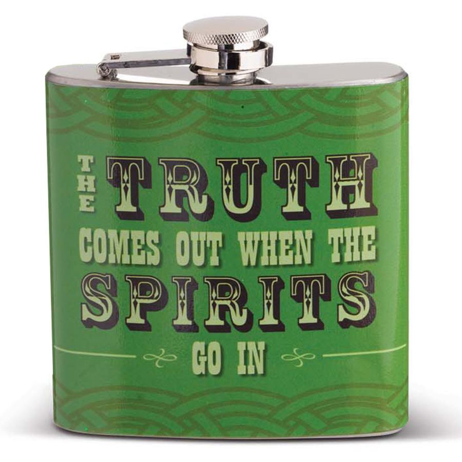 Green themed flask with an intricate pattern followed by the phrase “The Truth Comes Out When The Spirits Go In” in an old Western font. Our Novelty Flask collection features alcohol flask designs that celebrate a birthday, anniversary or event, making them ideal gifts or keepsake items.