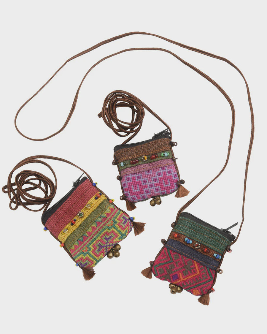 Tribal necklace, small vintage Hmong embroidered pouch with beads and brass bells on brown silk string, 30″, made in Thailand. Colors may vary, each product is unique.