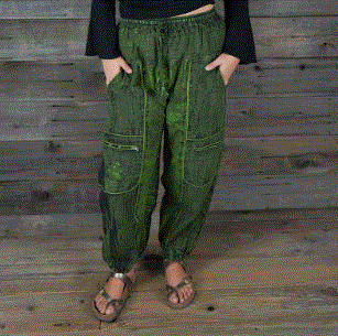 STONE BEAT PANTS Cotton Stonewash Zipper Pocket Elastic Waist Harem Pants. Oh the big harem pants, how we love you. These are loose fitting, wide leg harem pants which have been stonewashed to give them a vintage look and feel. These are unisex pants, with deep pockets and a cargo zipper pocket. There elastic waistband makes these and easy fit and oh so comfortable.