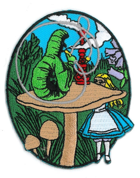Alice and Caterpillar, 3.25 x 2.5" iron on patch.  Art by Matt Stewart.