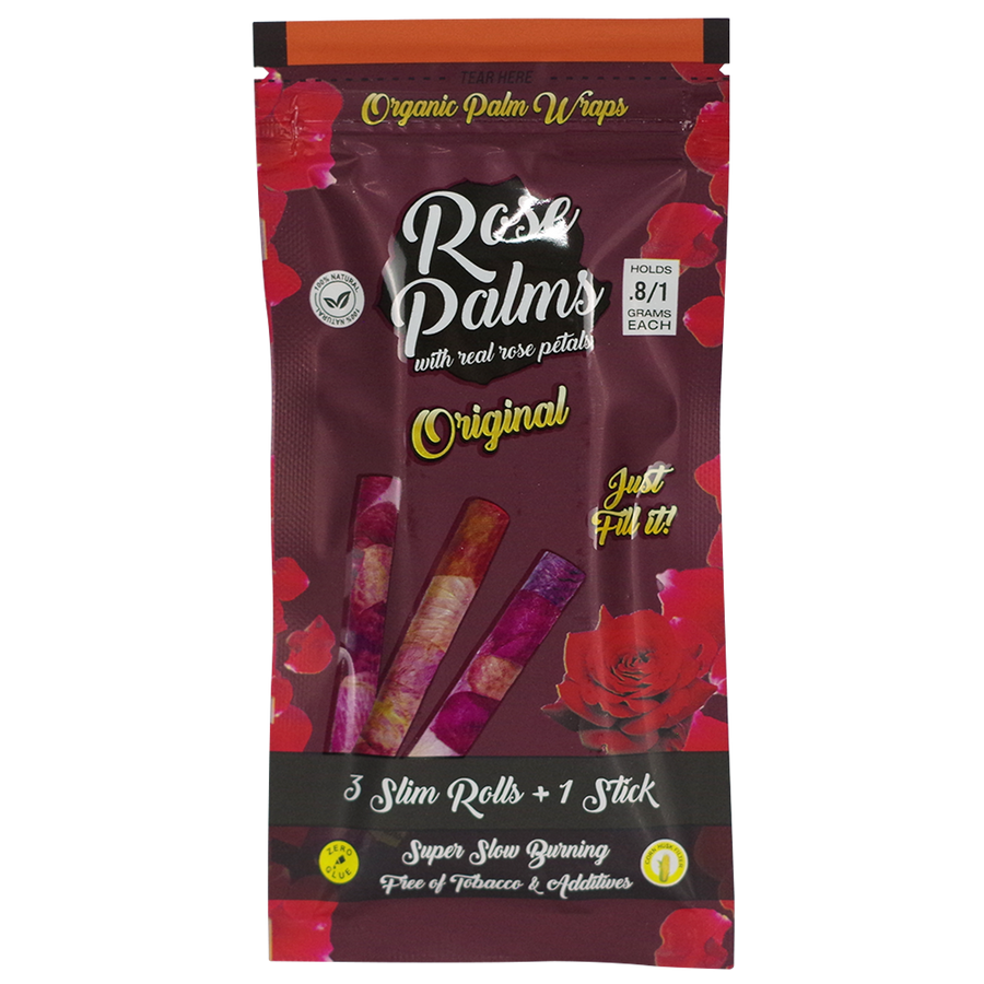 1 package of 3 slim rolls + 1 stick.  Rose Petal Wraps are cleaned with distilled water to remove impurities and pass through quality assurance inspections to provide our customers with an exquisite experience. Each hand-crafted rose palm begins as a naturally grown rosebud. The buds are then carefully selected for petal quality before being crafted around a natural palm leaf wrap, which creates a very slow burning experience. ​ The palm leaf wraps allow you to have more durability when filling your herbs, creating a delightful experience while burning. We use a hint of Arabic gum to craft our rose palms which have no additives or glue. Then pack into a protective Resealable pouch with a packing tool to keep the roses fresh and aromatic when you're ready to burn.