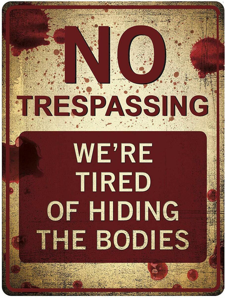 No Trespassing We're Tired of Hiding the Bodies Tin Sign