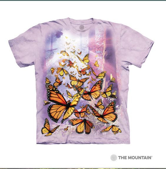 Monarchs are perhaps the most widely recognized of all butterflies because of their distinct orange and black wings. These attractive aviators are also known for their 3000-mile migration that many travel in the fall. Some fly all the way from Canada to Mexico for the winter! Artist David Penfound has created the Monarch Butterflies design that is simply astounding, and here at The Mountain®, we are proud to have it as a part of our unique collection of awesome tees!