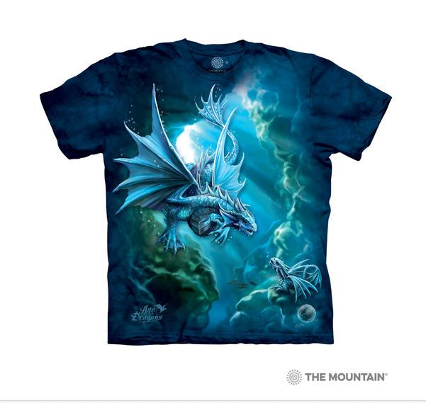 In the icy blue depths of the ocean, Mother and Baby Sea Dragon are emerging from their dark cavern to swim and explore the light of day. For the first time, Baby will plunge, swirl, and paddle through the deepest hollows of their reign, while Mother watches and guards with all her fierceness. Artist Anne Stokes has created another amazingly beautiful dragon t-shirt with the Sea Dragon design, bringing the fantasy realm to new depths.