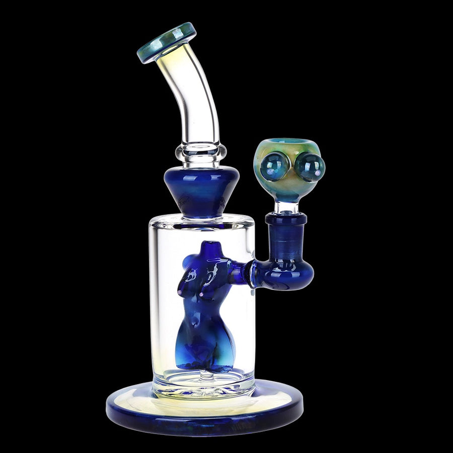 The Fumed Nude Bod Glass Water Pipe has a stemless joint connection and a bent neck design. The cylindrical chamber encases a perforated percolator shaped as a naked torso. Made from fumed borosilicate glass, the pipe body will change color over time with use. Includes a matching bubble style herb slide with breast-like grip marbles. Measures 8 inches (20.3cm) tall.