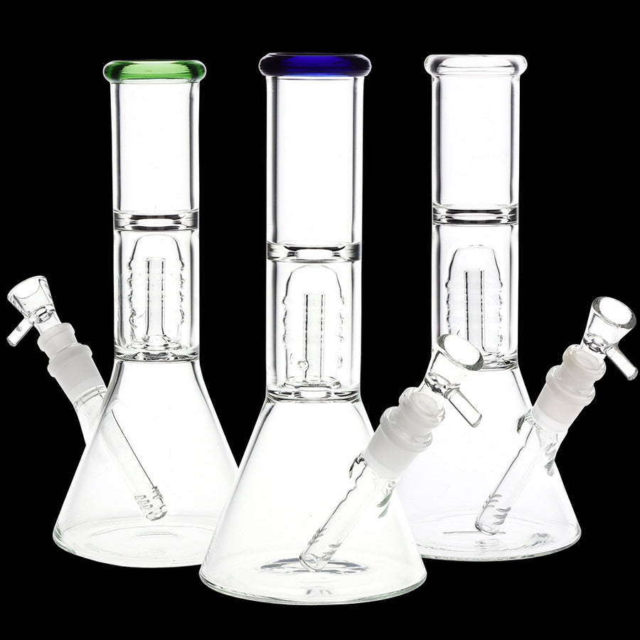 Standing 8 inches (20.3cm) tall, these Stacked Showerhead Perc Beaker Water Pipes are fitted with a slitted downstem diffuser and a stacked showerhead percolator located in the neck. These beaker style pipes include a glass downstem and a large 14mm male herb slide. Colors vary.