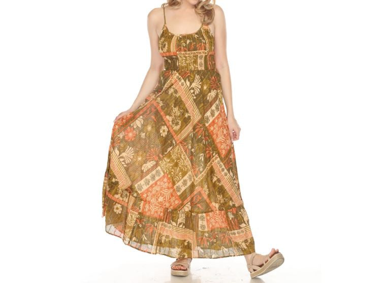 a bohemian-inspired maxi dress, featuring a charming patchwork design with floral and geometric motifs. Its lightweight fabric ensures comfort, while the adjustable corset back provides a customizable fit. The dress flows gracefully, offering an effortless silhouette, and comes in two earthy tones: Charcoal and Sage. Perfect for casual outings, festivals, or beach days, this dress combines versatility and style. Crafted for those who love a relaxed, vintage-inspired aesthetic with a modern twist.