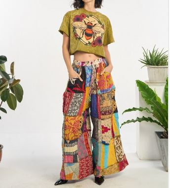 Patchwork Kantha Cotton Wide Pants w/Pockets