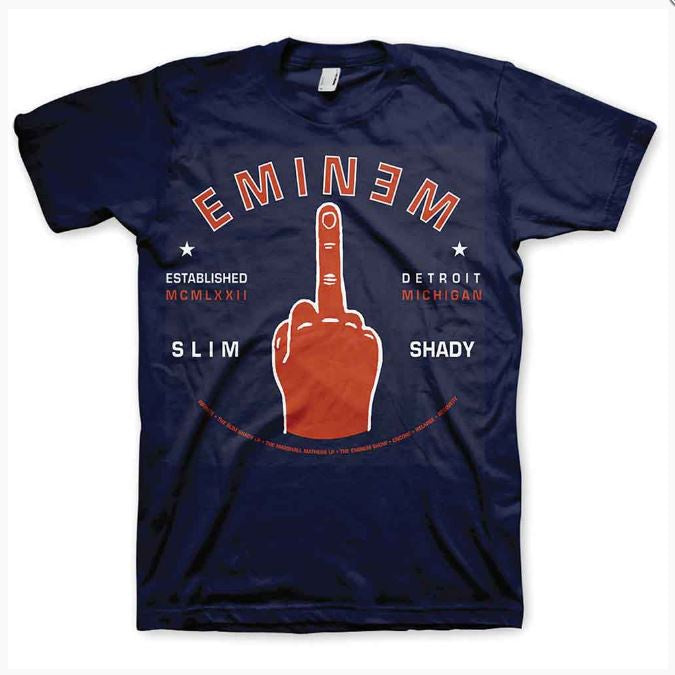 An official licensed Eminem Unisex Tee featuring the 'Detroit Finger ' design motif. This high quality t-shirt design is available in the navy blue colourway.