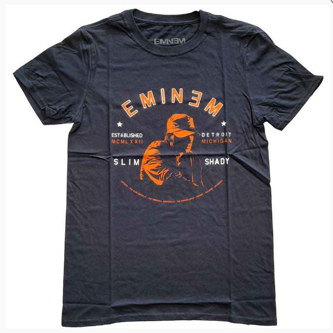 An official licensed Eminem Unisex Tee featuring the 'Detroit Portrait' design motif. This high quality t-shirt design is available in the navy blue colourway.