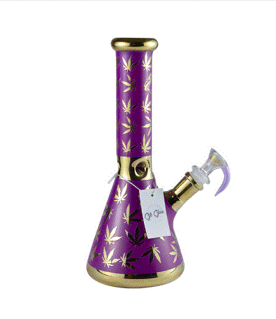 Glass Art - Watervase - Gili Glass - 14mm - 10in - Beaker Bottom w/ Ice Pinch - Electroplated w/ Leaf Designs - Asst. Color Accents