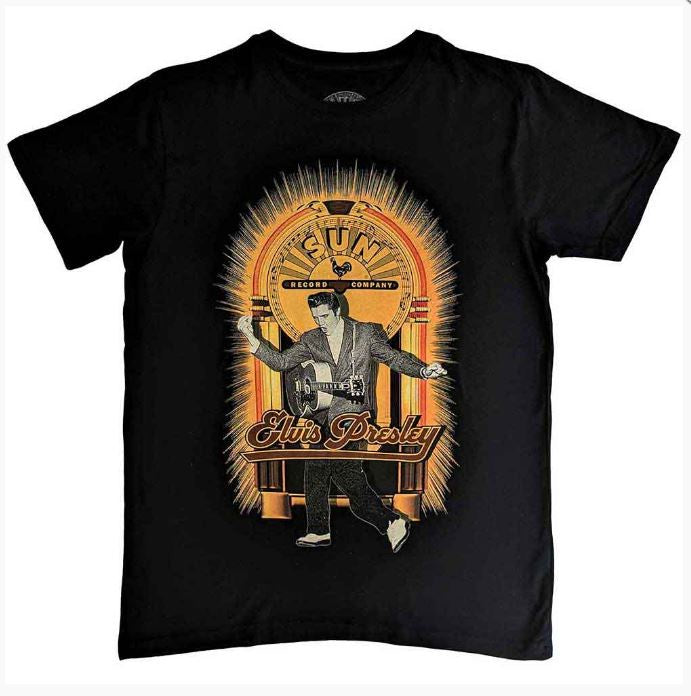 An official licensed Sun Records Unisex T-Shirt featuring the 'Elvis Dancing' design motif. This high quality T-Shirt is available in a black colourway.