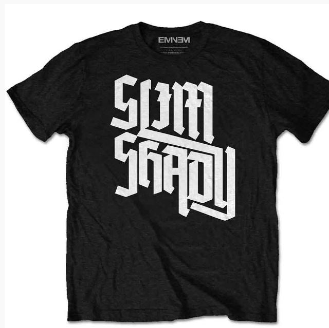 An official licensed Eminem Unisex Tee featuring the 'Shady Slant' design motif. This high quality t-shirt design is available in the black colourway.